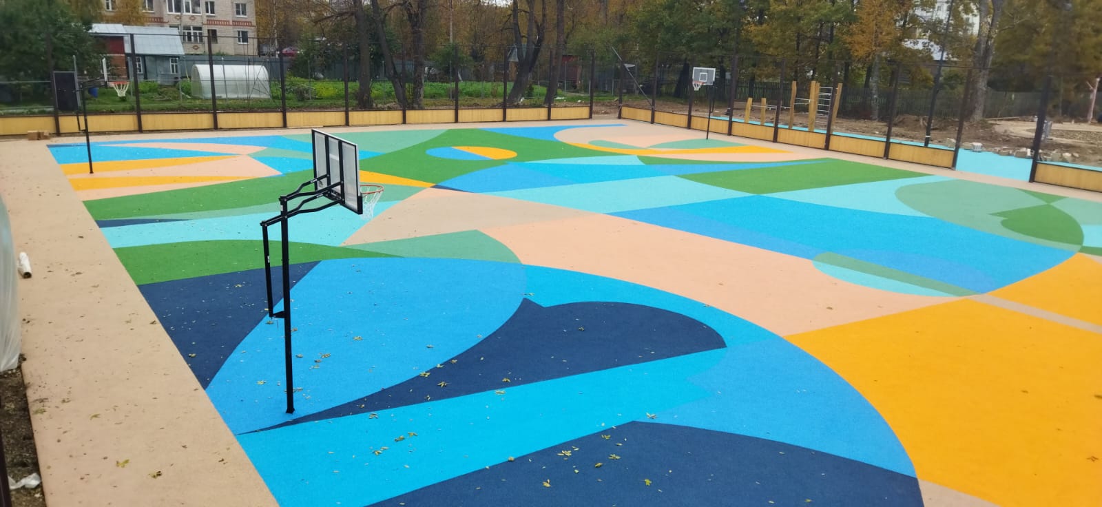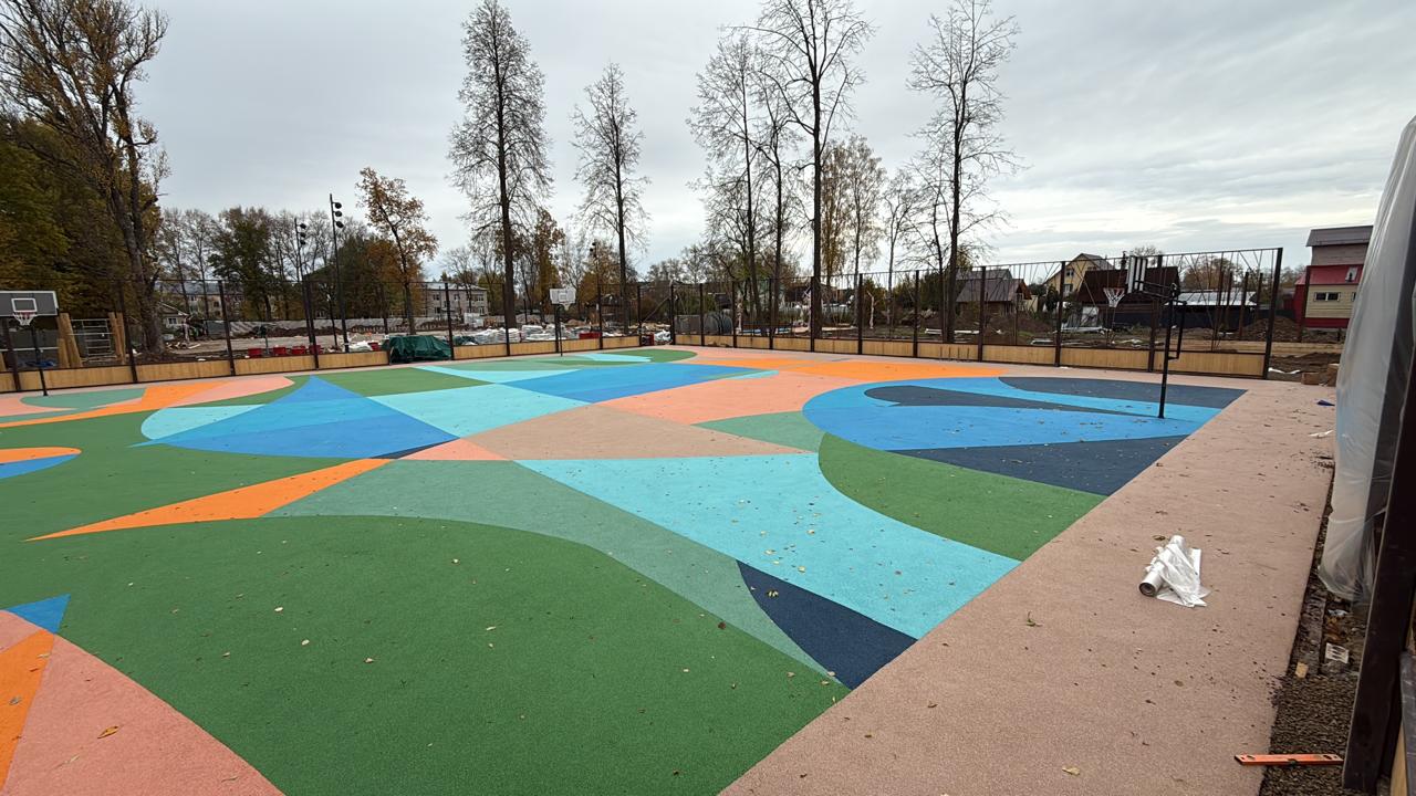 Ключевой принцип — фрагментарность и симметрия. Площадка лишена монотонных зон. Вместо этого она состоит из десятков «стеклышек» калейдоскопа: островков, дорожек и секторов чистого цвета, которые, сочетаясь, создают иллюзию объема и движения.